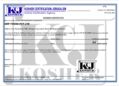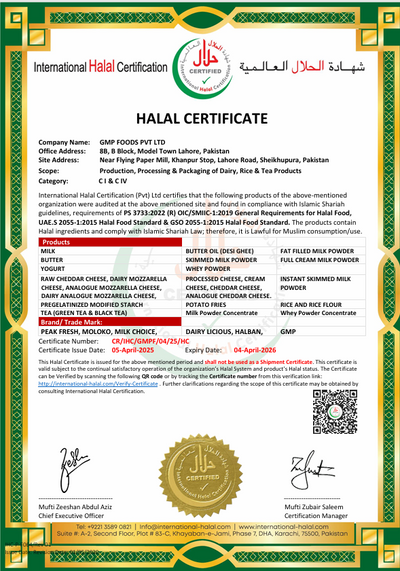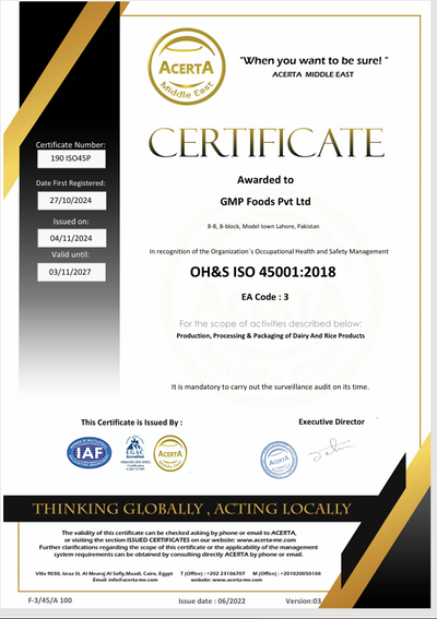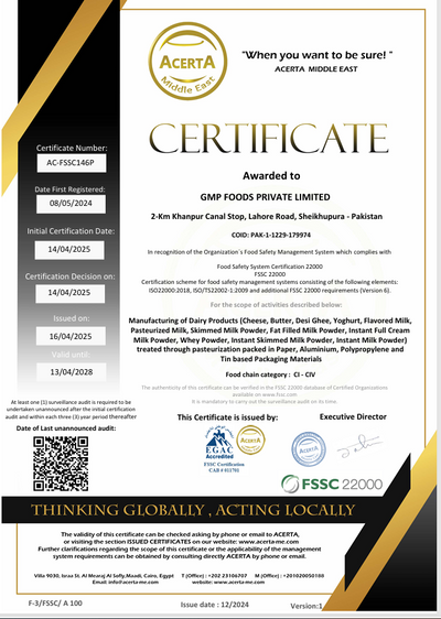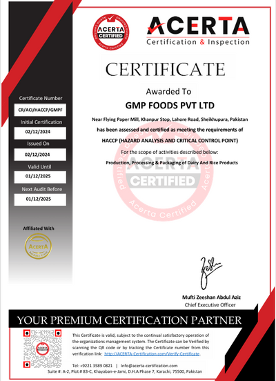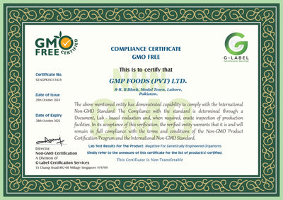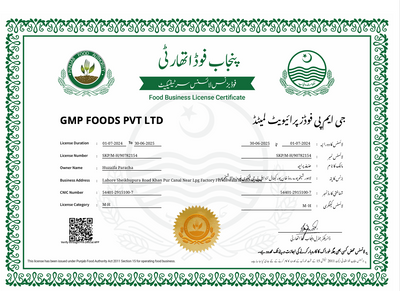 GMP Foods Pvt. Ltd. is proudly certified by International Non-GMO Standard, Punjab Food Authority, International Halal Certification, ACERTA, ISO, KCJ, and FSSC — ensuring global quality, safety, and compliance at every step.